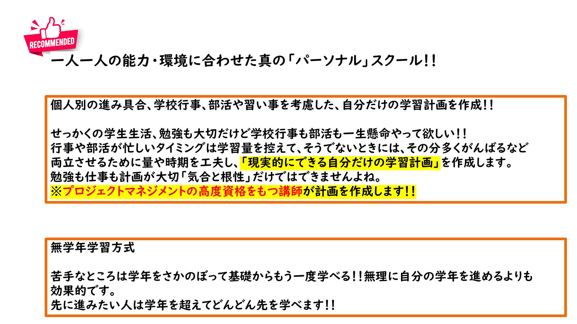 パーソナルジムのように一人一人の学力や部活・学校行事に合わせた学習計画を立て、「先生」として教えるだけでなく「コーチ」として生徒と一緒に伴走し結果を出すまでサポートいたします。