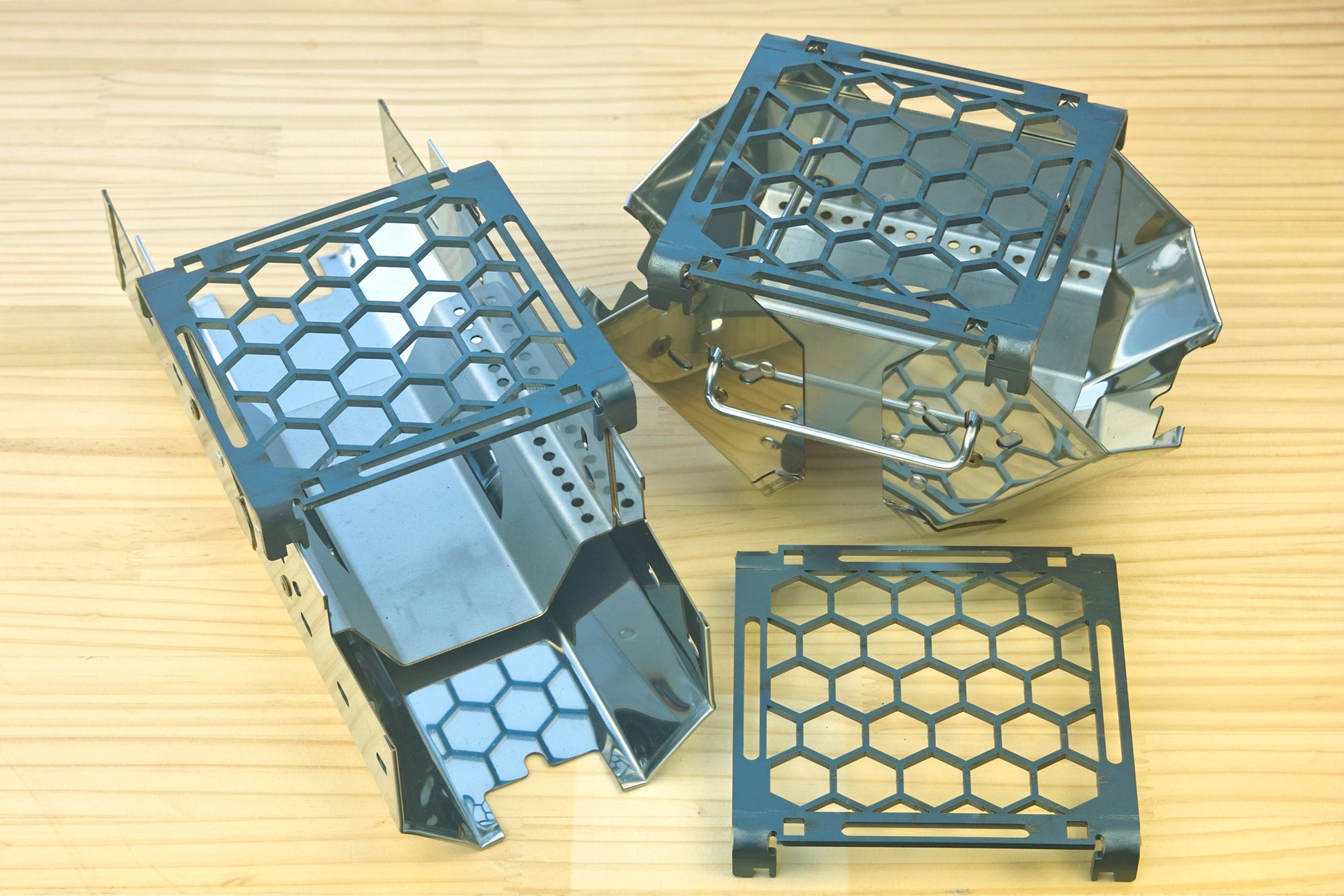 鉄板からレーザーカットという手法で切り出して作るこの五徳は、中心の亀甲部の開口率が80%となっております。開口面積を大きくとりつつ、強度を維持できる亀甲文様。焚き火やアルコールストーブの炎でも、ヌケが良く、ストレスがありません。