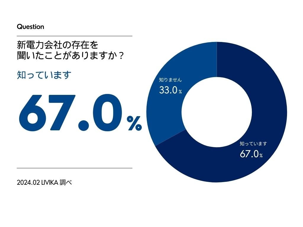 新電力会社の認知度に関する調査から、回答者のうち67%が「知っている」と回答されました。