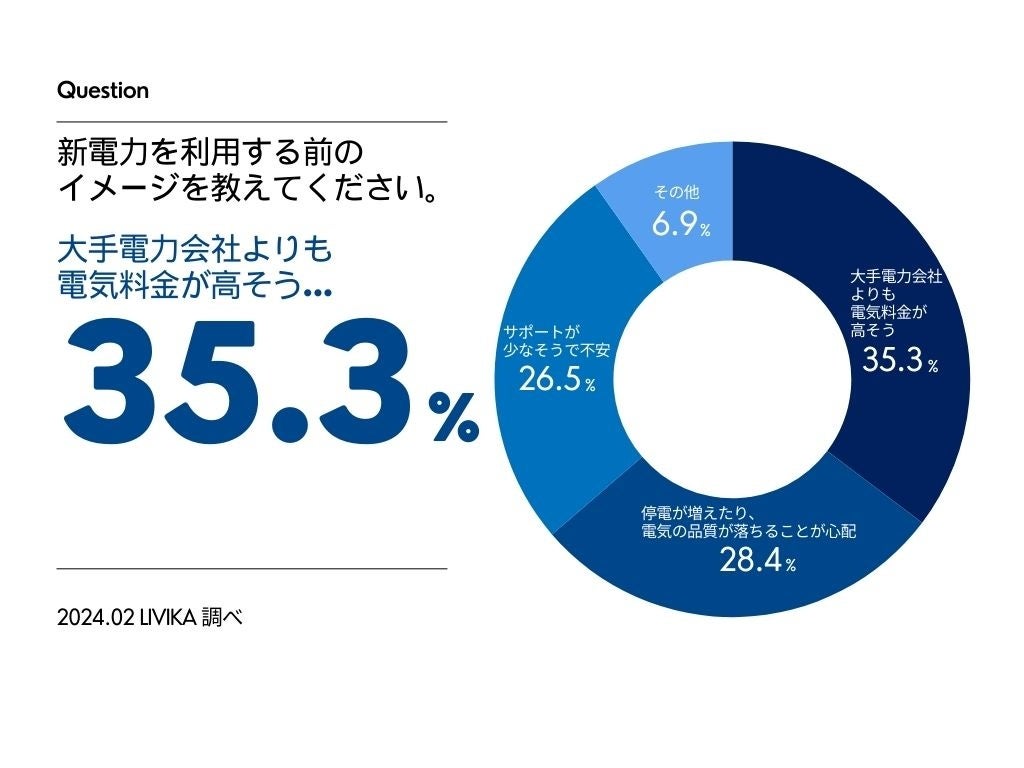 「大手電力会社よりも電気料金が高そう」(35.3%)、「停電が増えたり電気の品質が低下することが心配」(28.4%)、「サポートが不足しているように感じる」(26.5%)と、実に9割近くの方々がネガティブな印象を抱いていたことが分かりました。