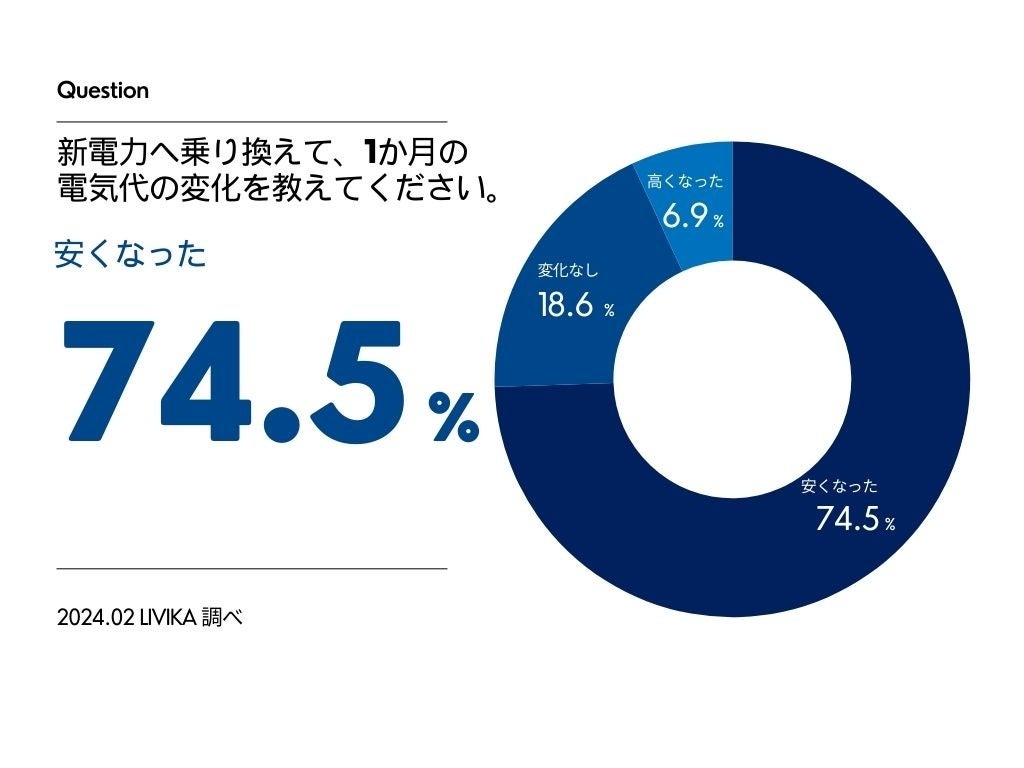 新電力会社へ乗り換えてから電気代が安くなったかどうかについて調査したところ、74.5%の方が電気代が安くなったと回答されました。