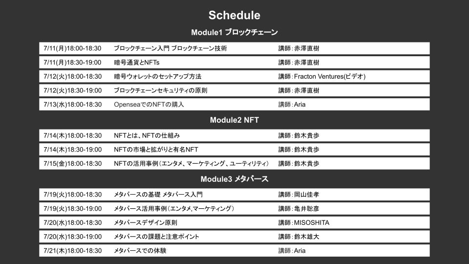 本プログラムは、Web3やメタバース領域でのビジネスを検討している企業様や個人の方を対象として、Web3の基礎から応用を理解し、実際にビジネスに活用するために必要な知識を学ぶライブ配信型の講義を提供いたします。講義は2週間、3つの分野にわたり開催され、「ブロックチェーン」「NFT(Non-Fungible Token/非代替性トークン)」「メタバース(仮想空間)」について基礎知識からビジネスでの活用事例まで網羅的に学ぶことができます。Web3×エンターテインメントの視点から、MetaTokyoが注目しているビジネス実例の考察や実際のWeb3プロダクトを体験しながら学ぶ講座もご用意しております。
