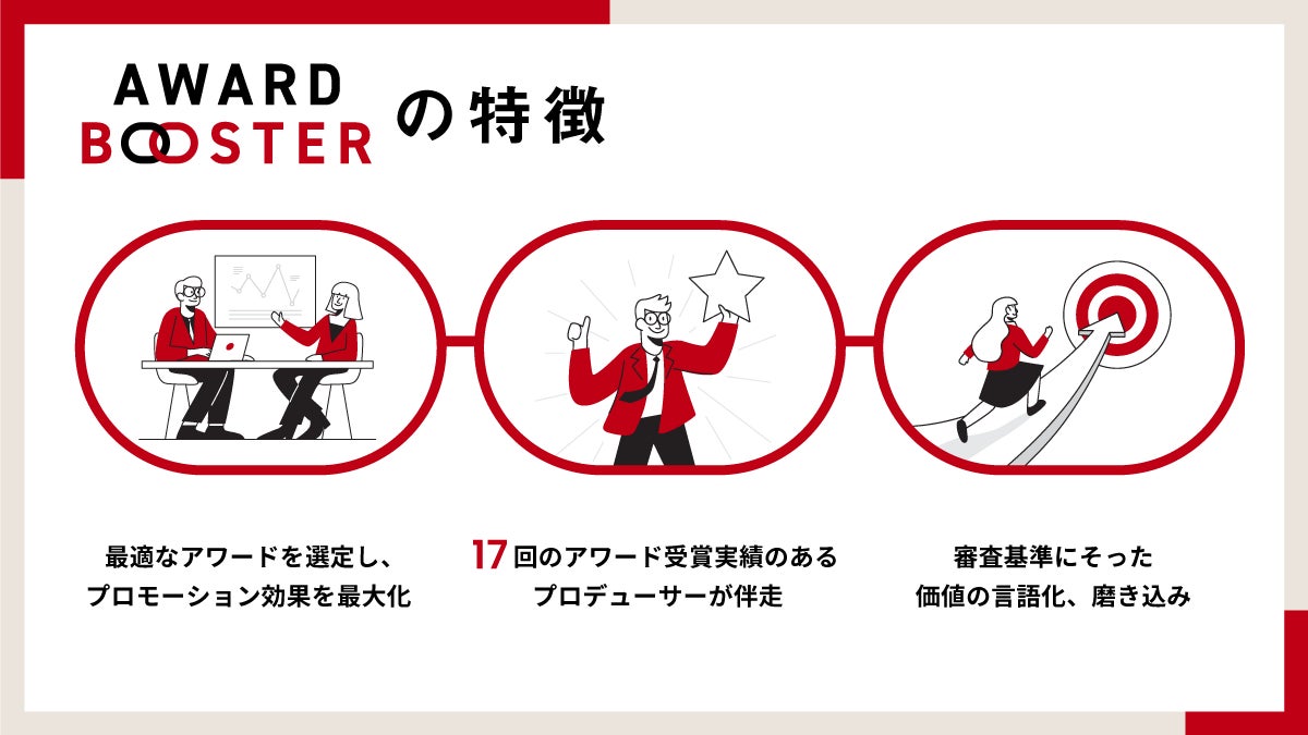 そこで、多数のアワード受賞実績があり、審査対応ノウハウや受賞によるプロモーション効果に関する知見を有するプロデューサーが伴走支援する「Award Booster(アワードブースター)」の提供を開始しました。