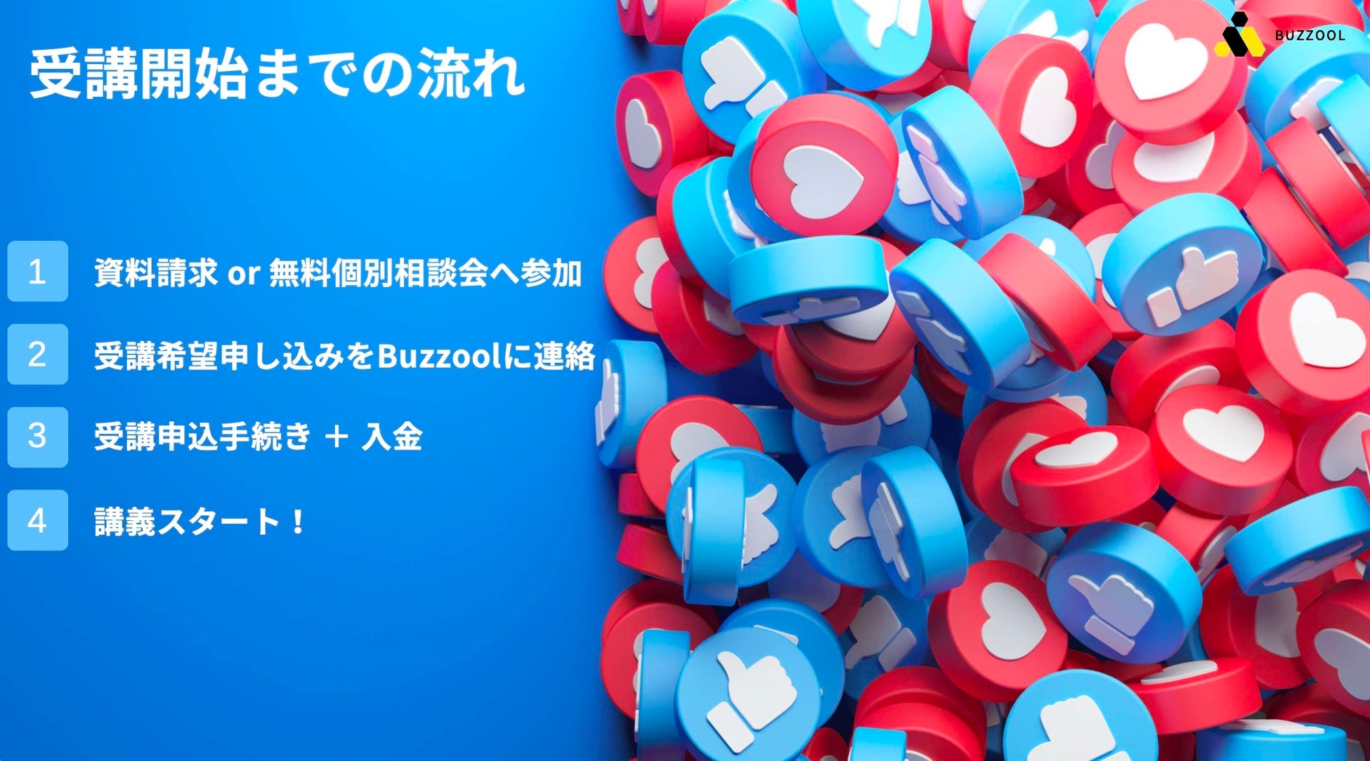 Buzzoolは株式会社カツオザブリッチが提供する「ゼロから影響力のあるアカウントを育てる」ことを目的としたSNS特化型マーケティングスクールです。「圧倒的コスパ」「伴走型コンサルティング」「リアルタイム直接指導」を通して卒業後は”ビジネスに影響力をもたらすSNS発信ができるようになる”そんな環境をご提供しております。