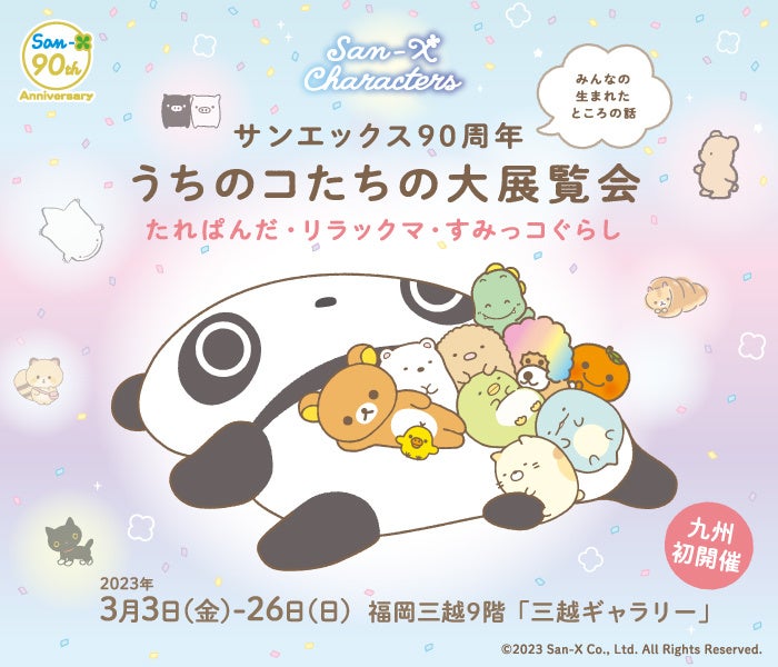 3月3日(金)より福岡三越で開催!『サンエックス90周年 うちのコたちの大展覧会』 ~たれぱんだ・リラックマ・すみっコぐらし みんなの生まれたところの話~