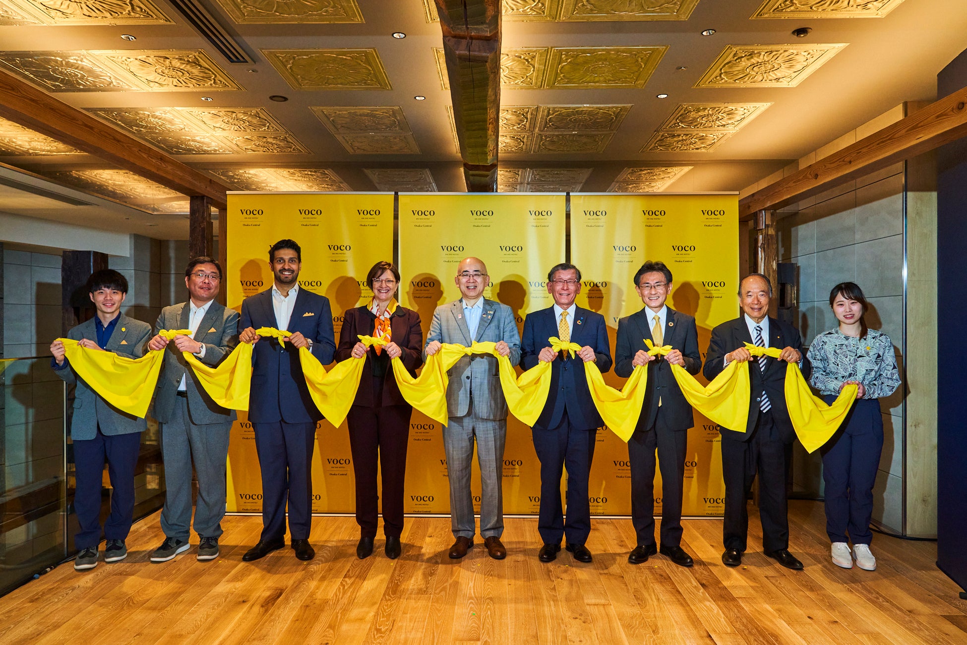 本日、午前10時より執り行なわれたオープニングセレモニーには、同ホテルを運営するIHGホテルズ&リゾーツ シニアバイスプレジデント マネージングディレクター 日本・オーストラレーシア&パシフィックのリアン・ハーウッド、同 日本&マイクロネシア マネージングディレクター アビジェイ・サンディリア、ホテル経営会社であるUDホスピタリティマネジメント株式会社 代表取締役社長 佐山義幸、voco大阪セントラル 総支配人 宍倉大地のほか、来賓として建物所有者であるNTT都市開発株式会社 代表取締役 社長 辻上広志氏(※1)、施工者である株式会社錢高組の代表取締役会長 錢高一善氏、公益財団法人大阪観光局 理事長 溝畑宏氏が参加し、vocoの特徴のひとつである環境に配慮した取り組みを表現し、伝統技法「ウコン染め」の風呂敷の結び目を参加者が一斉に解く演出を施したテープカットで開業を祝いました。