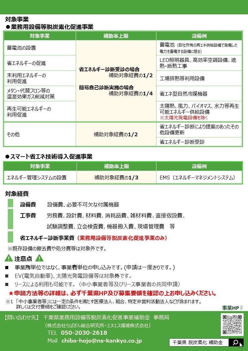 株式会社ちばぎん総合研究所(取締役社長:前田栄治)、エヌエス環境株式会社(代表取締役社長:須磨重孝)が、共同で事務局を受託している千葉県の補助事業「業務用設備等脱炭素化促進事業」「中小事業者等向けスマート省エネ技術導入促進事業」の申込み受付が開始されました!