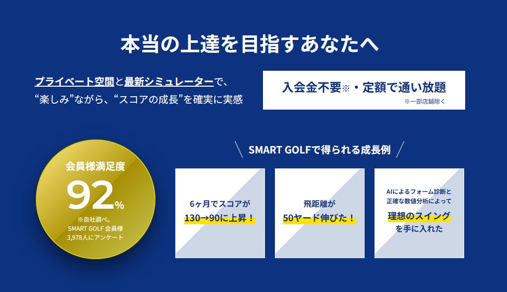 ‧SMART GOLFは定額制 / 完全会員制 / 通い放題の最新シミュレーター付きインドアゴル フ練習場で、初心者~トッププロまで幅広い層が快適に利用できる練習場です。そのサービス内容が認められ、会員様満足度92%との実績を誇っております(*自社調 べ:3,978人にアンケート)。