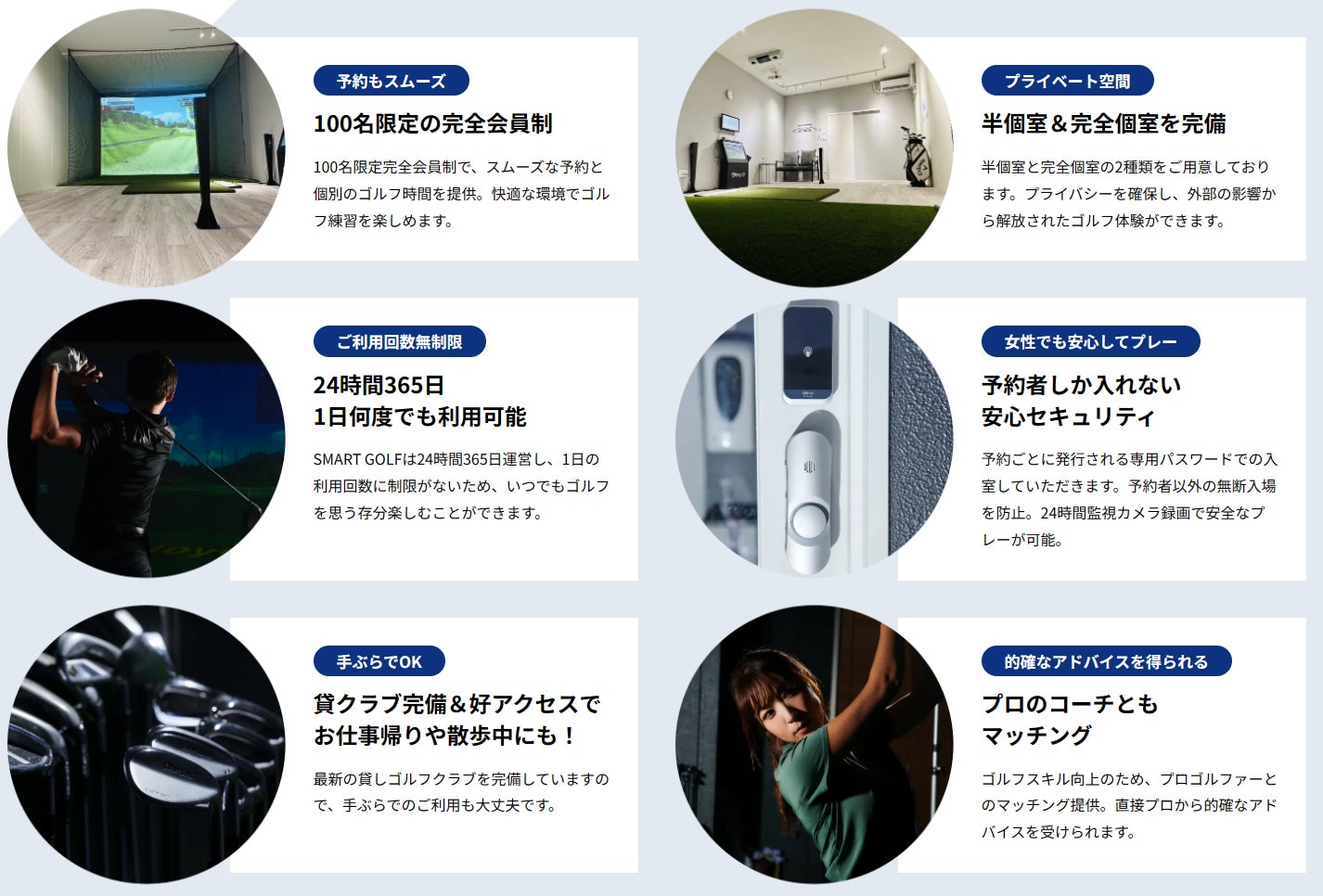 ‧100名限定(2打席店舗の場合)の少人数会員制なので予約が取りやすく、個室もしくは半個室の空間で人目を気にせずご自身の練習に打ち込めます。また24時間365日いつでも利用でき(*一部店舗除く)、回数制限もないので、お得にご利用いただけます。女性でも 安心の万全のセキュリティ体制を敷いており、貸クラブも完備していますので、手ぶら利用やクラブをお持ちでない方も楽しめます。ご要望のある方には、SMART GOLFで訓練を受けたレッスンコーチとのお引き合わせもしています。