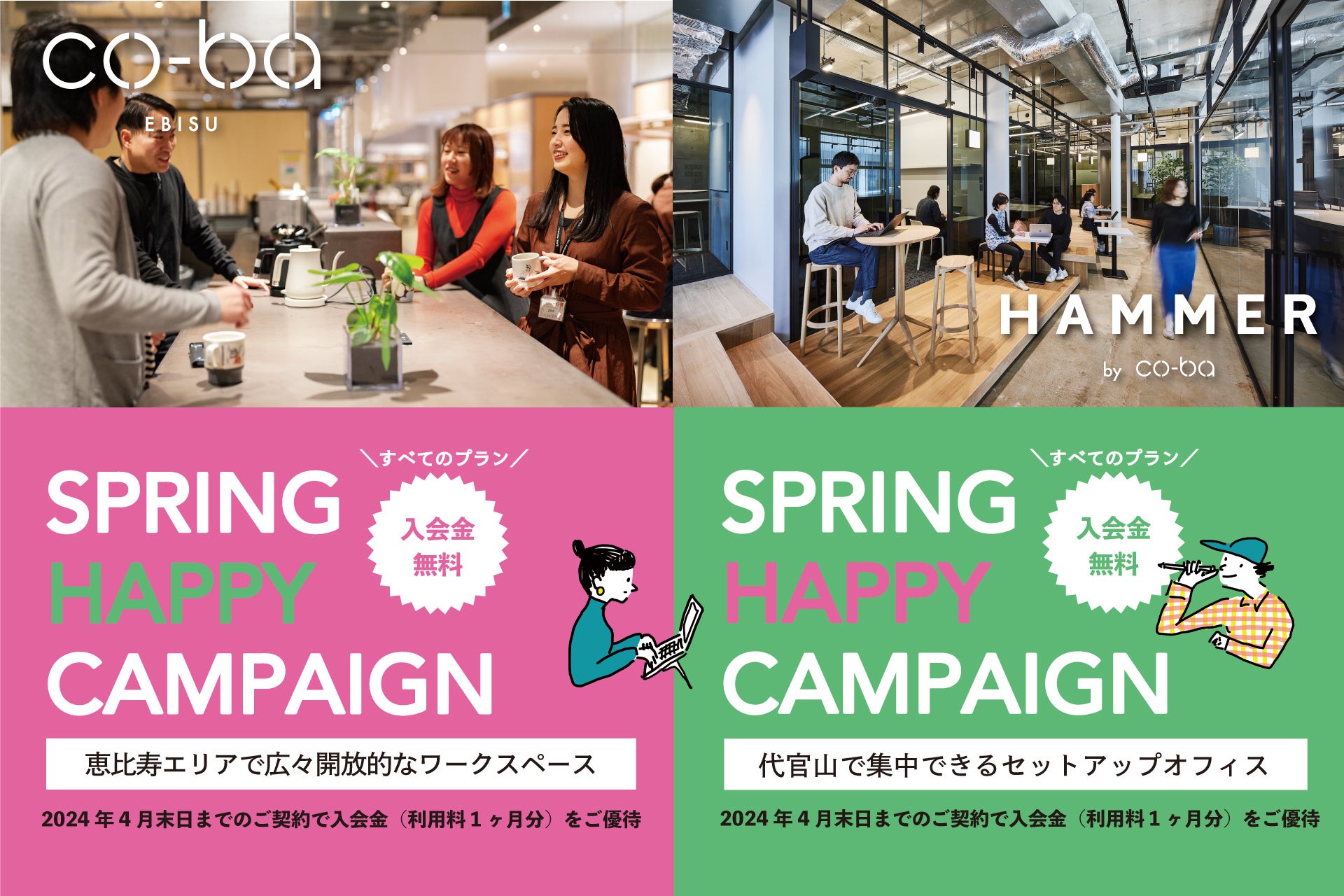 バ・アンド・コー株式会社(本社:東京都渋谷区 代表取締役会長:中村真広)が運営するシェアオフィス&コワーキングスペース「co-ba ebisu」と「HAMMER by co-ba」は、募集中の全プランについて期間限定で入会金無料となる春のキャンペーンを実施します。
