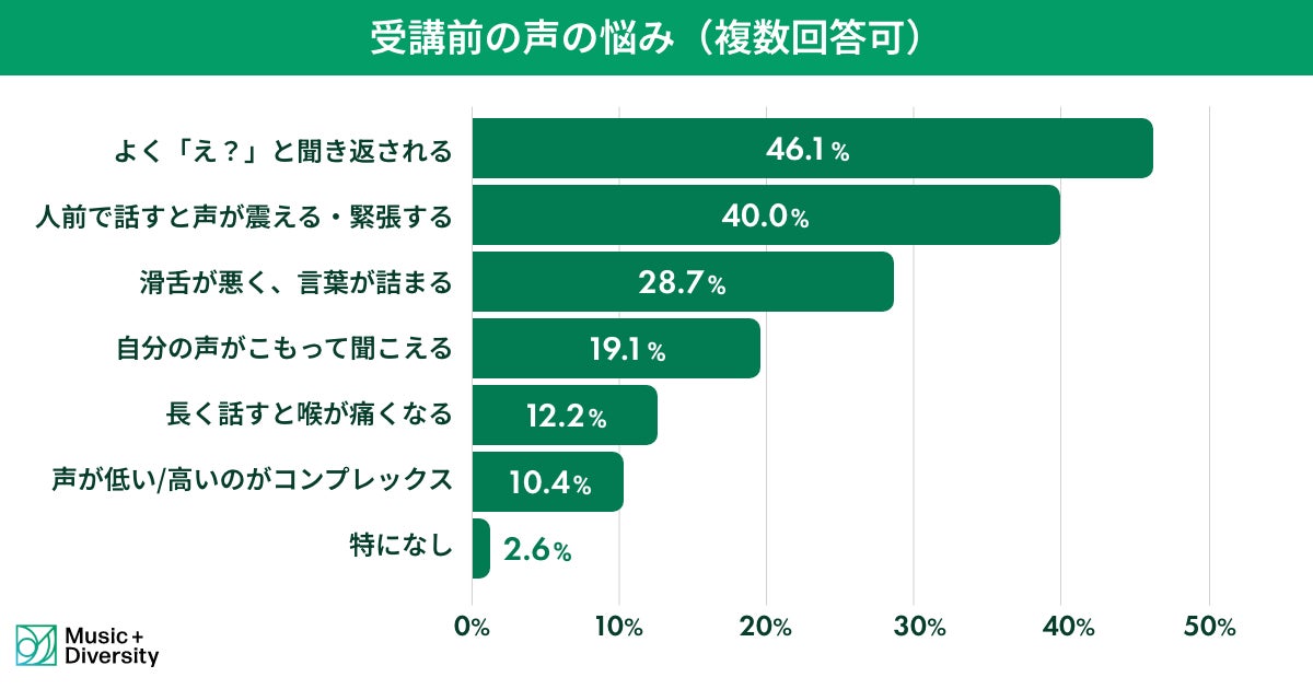 受講前の悩みは「よく『え?』と聞き返される」(46.1%)が最多。次いで「人前で声が震える・緊張する」(40.0%)