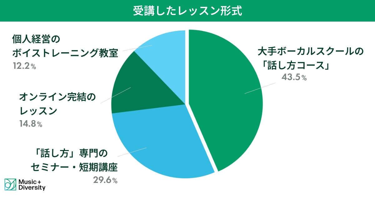 受講形式は「大手ボーカルスクールの話し方コース」が43.5%と最多。専門セミナー(29.6%)、オンラインレッスン(14.8%)が続く