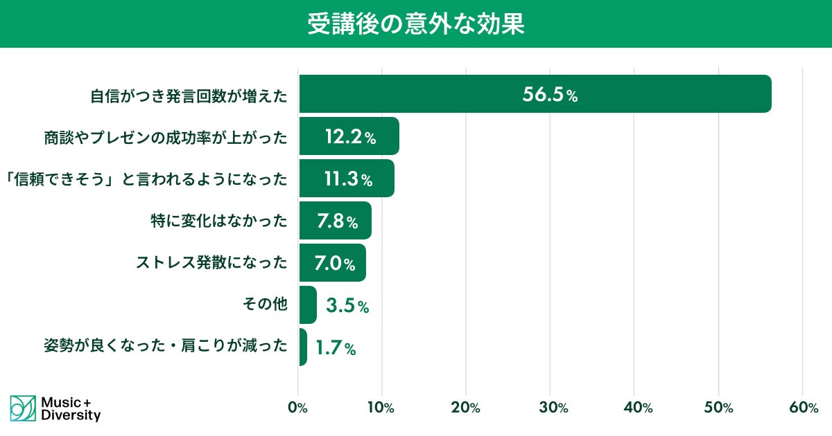 半数以上が、レッスンを通じて自信を持って発言できるようになったと実感しています。声のトレーニングは単なる発声技術の向上だけでなく、自己肯定感やコミュニケーションへの積極性を高める効果があることが明らかになりました。