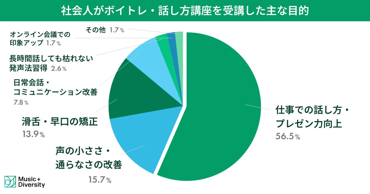 また、「声の小ささ・通らなさの改善」(15.7%)や「滑舌・早口の矯正」(13.9%)といった、声そのものの悩みを解決したいという目的も一定数見られました。