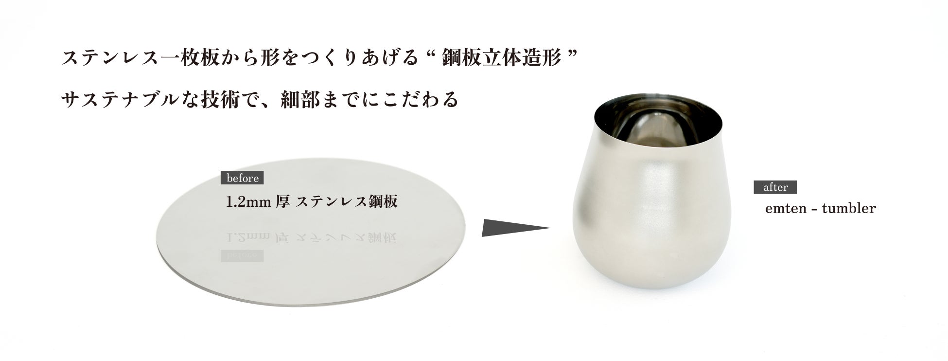カネミツは、回転成形やプレス工法によって、一枚の鋼板を増肉・減肉させ複雑な形状を成形する技術に長け、これまで、高度な自動車部品を中心に開発製造を行ってまいりました。一枚の鋼板から成形するため、切削などに比べて素材ロスが非常に少ないことが特徴です。一般的にはあまり目に留まらない自動車部品。しかし、緻密な技術が求められる分野であり、カネミツには、目に見えない部分にまでこだわり抜く文化が息づいています。emten - tumblerは、独自に培ってきたこれらの技術を駆使し、目に見えない「断面」にまでこだわり抜いた、革新的なプロダクトです。発売に先立ち、2024年6月28日-7月31日までの間、クラウドファンディングを実施。ご支援いただいた方にはリターンとして、emten -tumblerをいち早くお届けいたします。