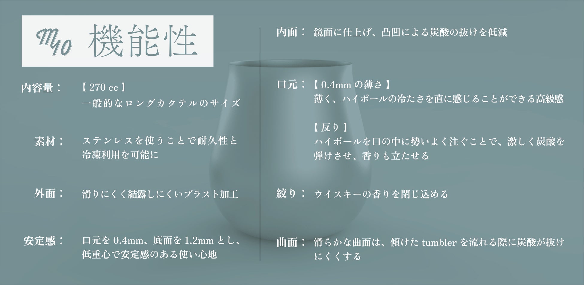 滑らかな曲面のフォルムにすることで、tumblerを傾けて丁寧に炭酸水を注いだ際に炭酸が抜けにくい効果が。また、内面を鏡面に仕上げ、凸凹による炭酸の抜けを低減。口元をわずかに反らせることで、飲んだ時にハイボールが勢いよく流れ込み、ピリピリとしたきめ細やかな炭酸が、口の中で上品に弾ける。さらに、耐久性に優れたステンレス製のtumblerは冷凍可能。冷凍庫でキンキンに冷やし、氷を使わずつくることで、最後まで薄まらずにハイボールを楽しめる。