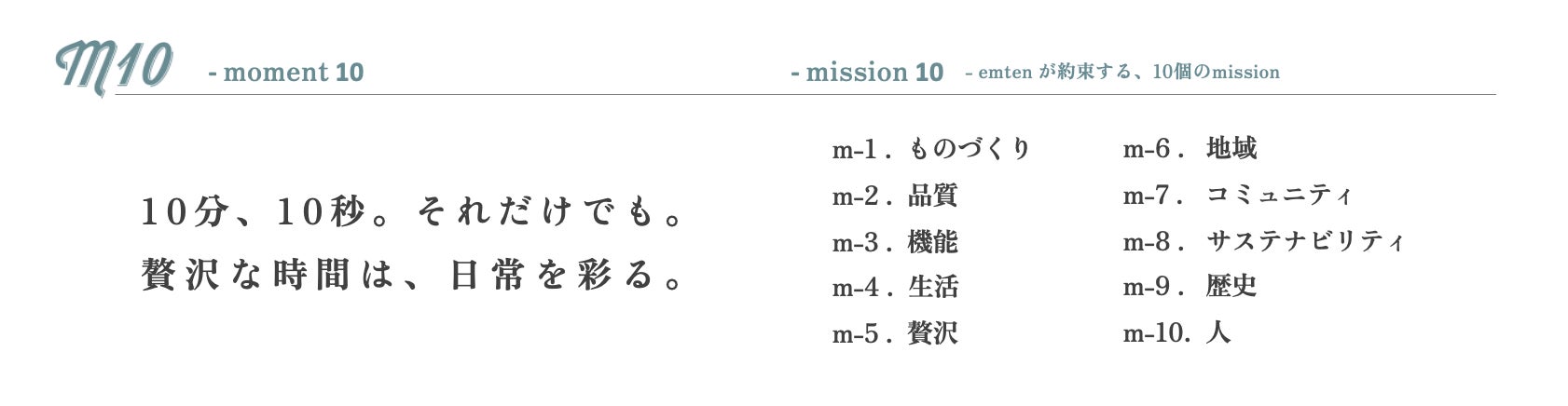 カネミツでは、2023年より新規事業プロジェクトを立ち上げ、自社技術を活用した一般消費者向けの新製品開発を行ってまいりました。そしてこの度、新ブランド「m10(エムテン)」をローンチしました。日常を彩り、人を豊かにする。豊かな瞬間を増やし、幸せの輪を広げる。そんな世界観を目指し、ものづくりと真摯に向き合い、カネミツならではの価値提供を目指してまいります。