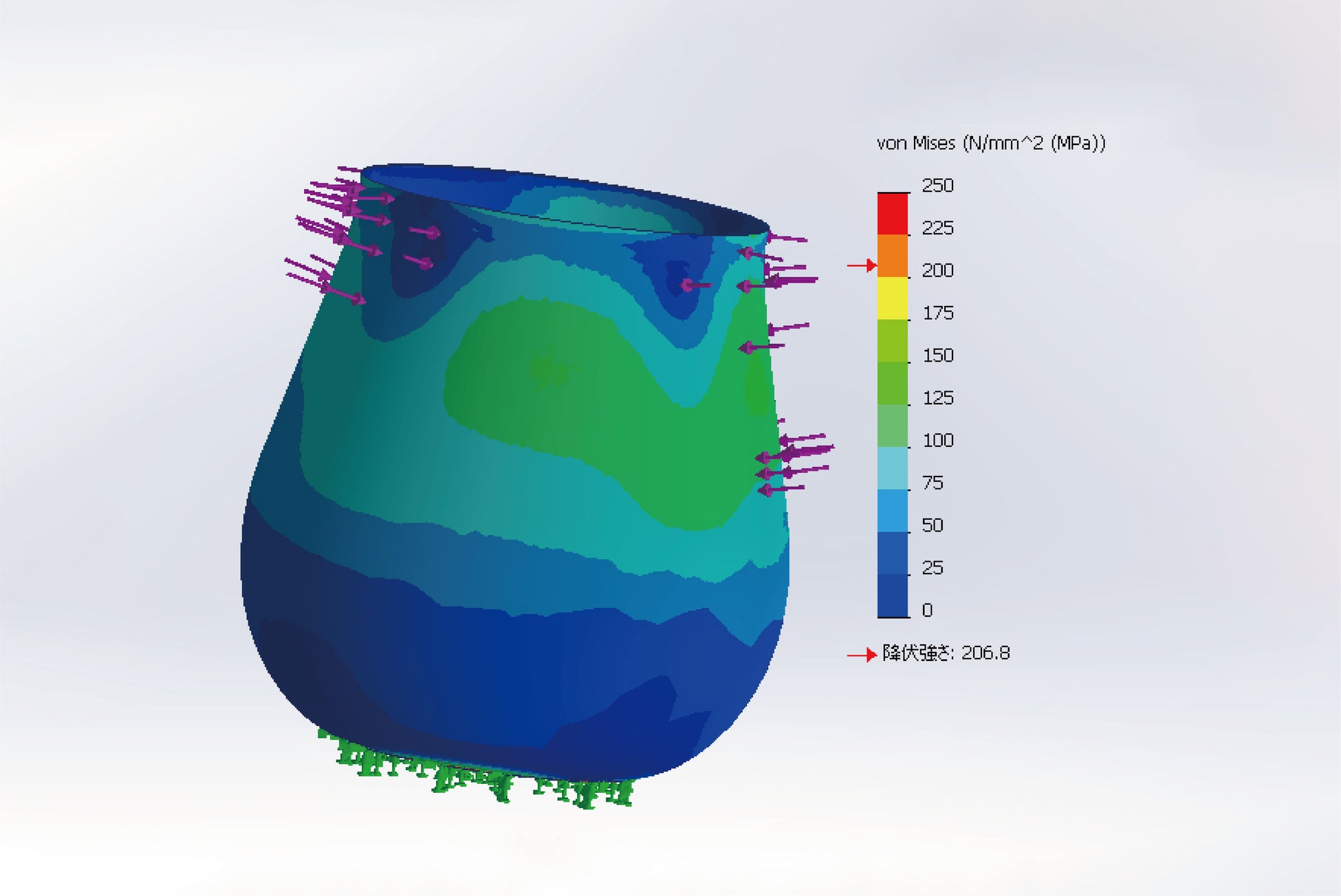 まずは厚さ1.2mmのステンレス板をプレス機で絞り上げるように加工し、カップ形状に(絞り加工)。その後、カップの内部から圧力をかけて内側から膨らませ (バルジ加工) 、しずく型の滑らかな曲面を実現。