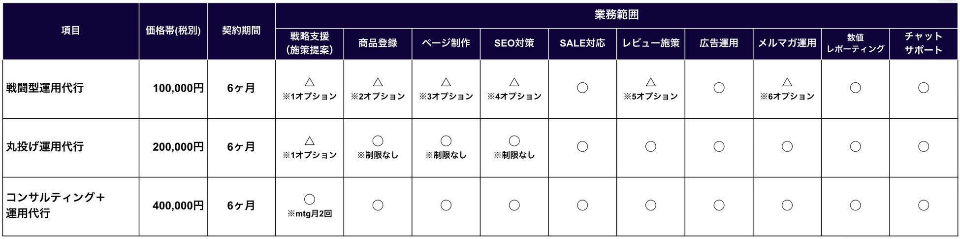 事業規模や優先課題に応じて、商品登録・ページ制作・SEO対策・メルマガ運用などのオプションを個別に追加できます。将来的には「丸投げ運用代行(月額20万円)」や「コンサルティング+運用代行(月額40万円)」へのアップグレードも可能です。