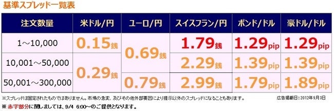 SBI FXトレードが提供する外国為替証拠金取引「SBI FXTRADE」は、2012年9月4日(火)午前6時より、スイスフラン/円1.79銭(1万通貨注文まで)をはじめとする複数通貨ペアの基準スプレッド縮小を実施いたしますのでお知らせいたします。