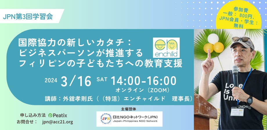 日比NGOネットワーク(略称 JPN、運営委員会代表:伊藤道雄)は、3月16日(土)の14時から、JPN第3回学習会:国際協力の新しいカタチ―ビジネスパーソンが推進するフィリピンの子どもたちへの教育支援―を開催します。【詳細・お申込:https://jpngakushukai20240316.peatix.com/】
