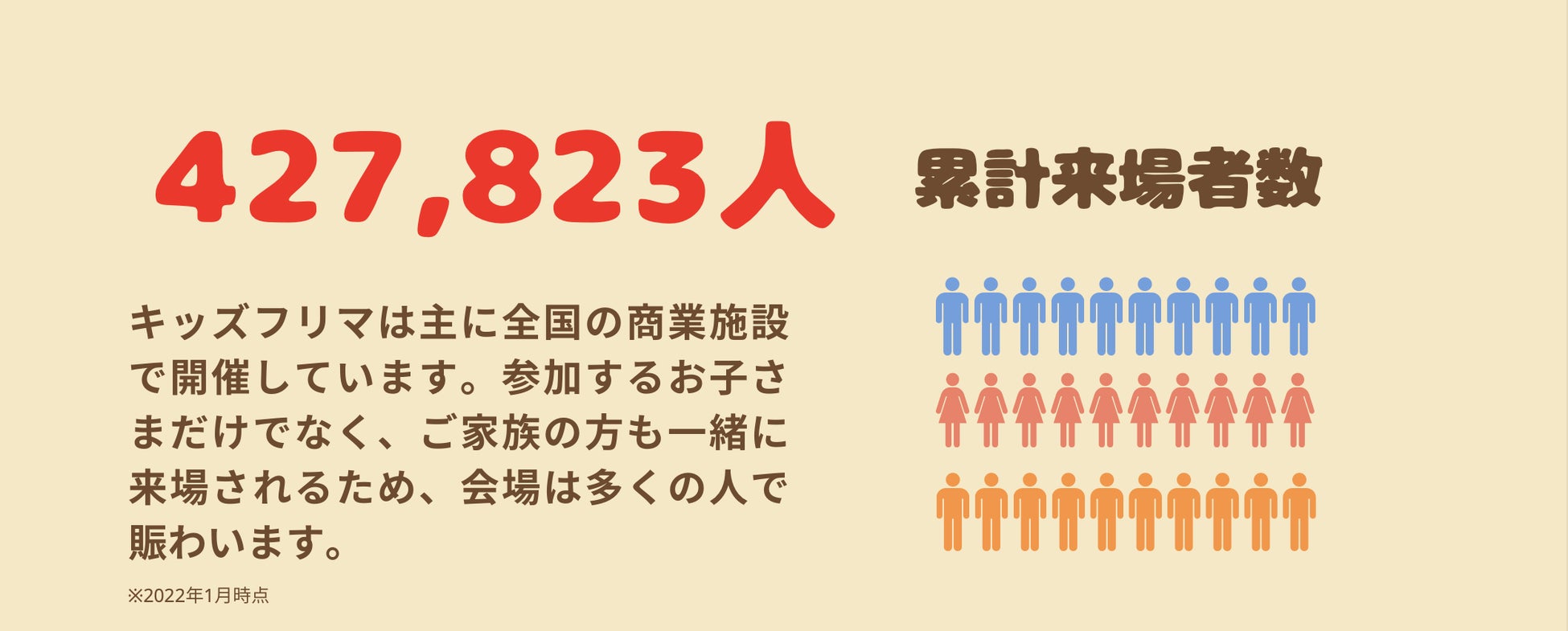 大人向けフリマ会場内での子ども向けイベントとしてスタートしたキッズフリマは、少しずつ規模を拡大し、今では年間100回を超えるペースで開催しています。商業施設を中心に開催しており、家族ぐるみで楽しむ事ができるイベントとして、ご好評をいただいております。