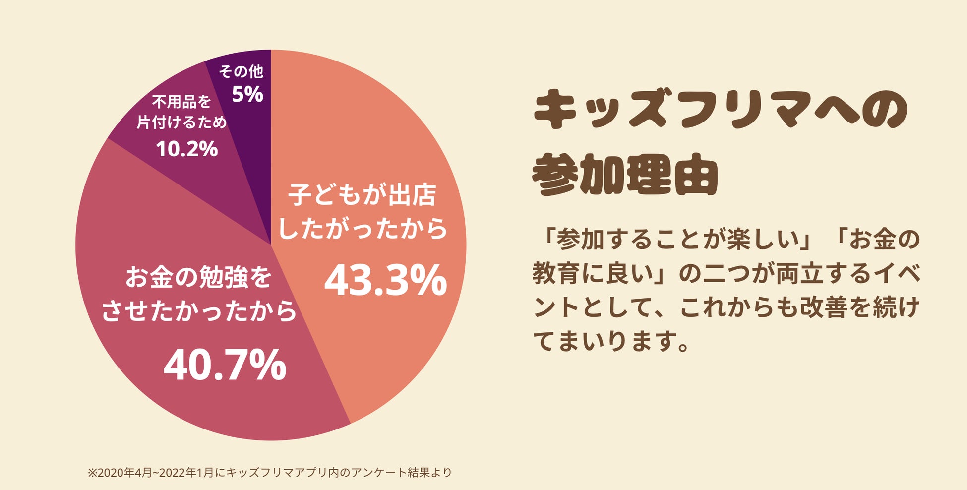 キッズフリマは、全国の小学校でのチラシ配布を通じて集客をしているため、多くの場合、お子さまが学校で配られたチラシをみて「参加してみたい」と親御さまに言われるところから始まります。その後、親御さまからも「教育に良さそうだから参加させてみよう」と参加のご判断をいただくケースが非常に多く、アンケートの結果にも現れています。