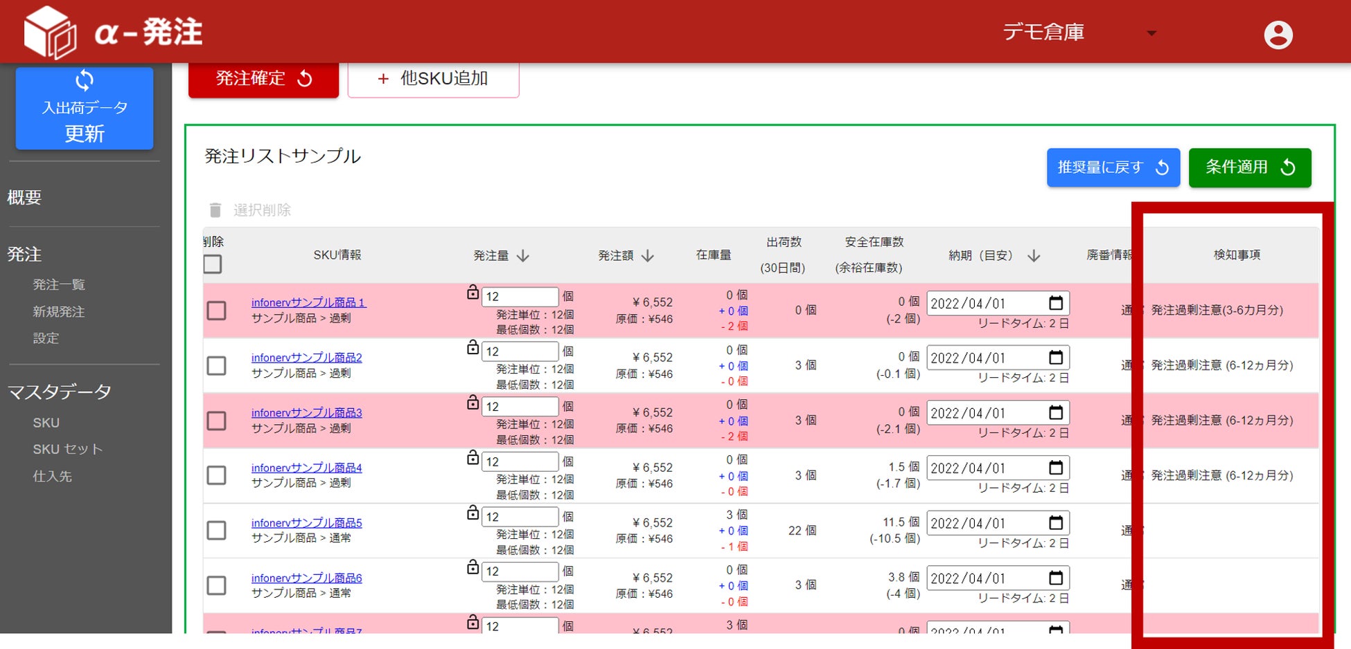 EC小売りおよび卸売り事業者向けに、適切な発注リストを自動で生成するAI「α(アルファ)-発注」を提供する株式会社infonerv(東京都杉並区、代表取締役:江田研人 以下、当社)は、過剰発注になってしまう危険性の高い商品を自動で検知して、ユーザーに注意喚起する機能の提供を開始しました。これにより「α-発注」の利用ユーザーは、発注前に過剰発注の危険を知ることができ、在庫量を適切に保つことが可能になります。