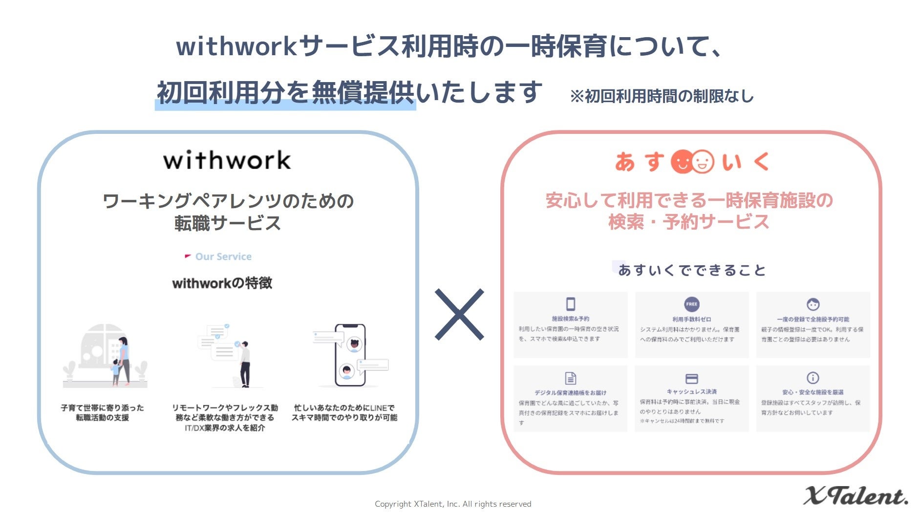 〜スマホ&LINEで使える一時保育検索・予約システム「あすいく」が、ワーキングペアレンツ向けの転職サービス「withwork」と連携し、一時保育の無料利用キャンペーンスタート〜