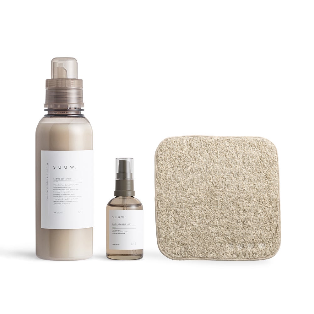 ローンチ時より人気の柔軟剤と、同じ香りのルーム&ファブリックミストをセットにし、限定価格でご用意いたしました。通常価格より10%OFF、さらにノベルティとしてオーガニックコットンのオリジナルミニハンドタオルもプレゼント。