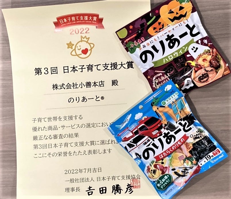 株式会社小善本店(本社:東京都台東区、代表:小林善昭)の、『のりあーと®』商品シリーズは、「第3回日本子育て支援大賞2022」(主催:一般社団法人 日本子育て支援協会)を受賞しました