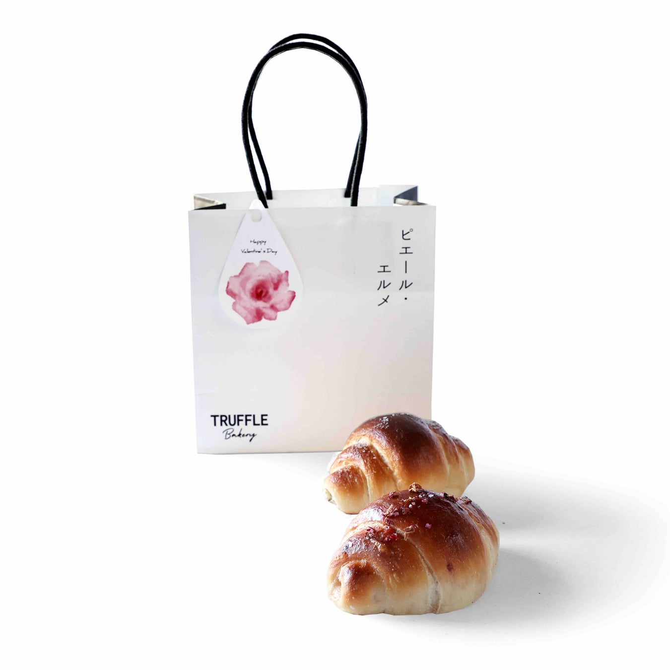 第一弾は初お披露目の「ローズの塩パン」のSETをご用意しました。フランボワーズを練りこんだ生地、ローズとライチを混ぜ込んだ自家製のローズバターを巻き込み、ローズエッセンスとローズの花弁を載せて香りをふんだんに楽しめる逸品に仕上げました。最後にフランボワーズジャムを絞り入れ、バターとジャムの風味も楽しめる、バレンタインにもぴったりな華やかな逸品となっております。また、トリュフを3段階使⽤し、⽣地はカナダ産⼀等級⼩⻨を使⽤したTruffleBAKERY⼀番⼈気商品の「⽩トリュフの塩パン」とのセットをオリジナル限定ショッパーに⼊れ2⽉3⽇(⼟)から2⽉14⽇(水)の12⽇間限定販売いたします。バレンタインデーのギフトにもぴったりな限定セットを、是⾮この機会にお召し上がりください。