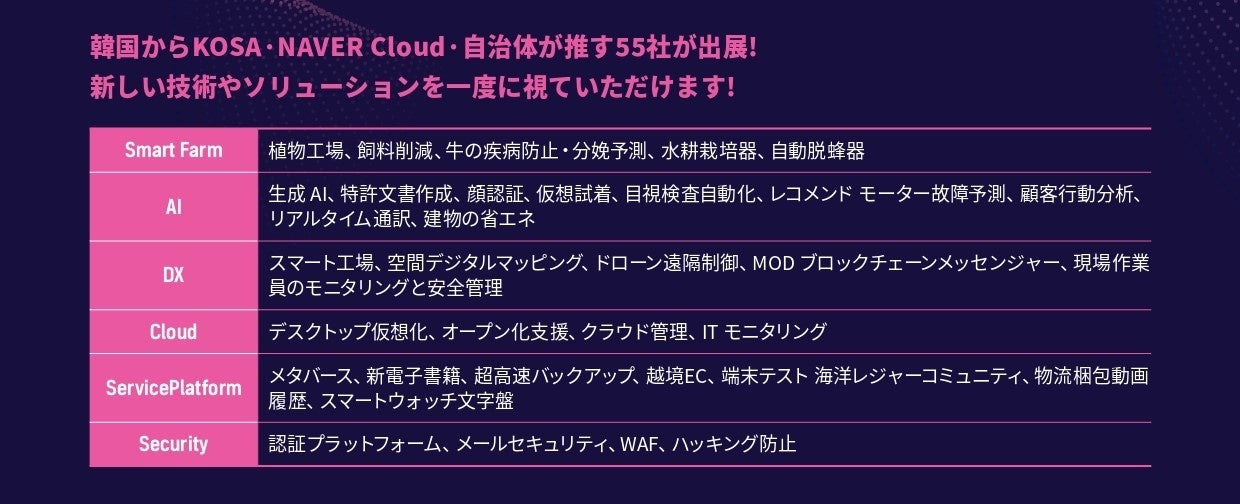 日本全体でDX推進が進む中、KOTRAは韓国有望のICT企業の最新技術を紹介し、日本進出をサポートするため韓国SW産業協会(KOSA)、NAVER CLOUD、情報通信産業振興院(NIPA)と共に<Korea ICT EXPO in Japan>を開催いたします。本展示会は、AI、クラウド、スマート農業など55社の韓国企業が参加し、製品/サービスを展示、日本企業との商談会を行います。