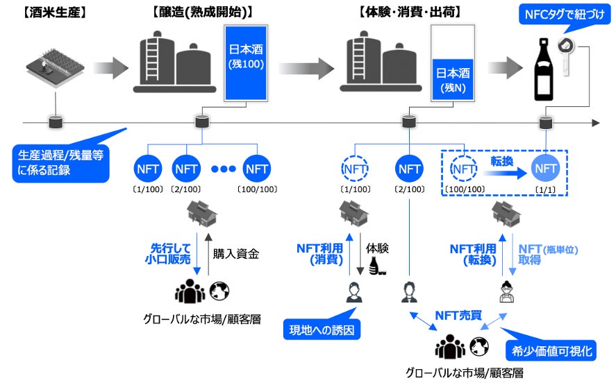 「資金繰り」や「新たな体験価値」に対しては、「トレーサブルNFT」の仕組みを日本酒に適用した「日本酒トークン」により、リアルアセットやトレーサビリティ情報を紐づけた日本酒(醸造・熟成段階)に関する権利(将来債権等)をNFTとして先行/小口販売することで、古酒や熟成酒へ挑戦する酒造会社の前広な資金調達を可能にすると共に、幅広い消費者を対象としたブランドエクスペリエンスの提供を可能とします。当該NFT保有者は、当該権利を熟成期間中にNFTとして第三者へ譲渡し資金化することや、権利を行使して調合・出荷した個々の「日本酒」(瓶)を紐づけたNFTに転換し、直接利用(飲酒)又は第三者への譲渡が可能となります。これらの「日本酒トークン」の権利移転はブロックチェーン上で完結するため、グローバルな取引も容易になります。