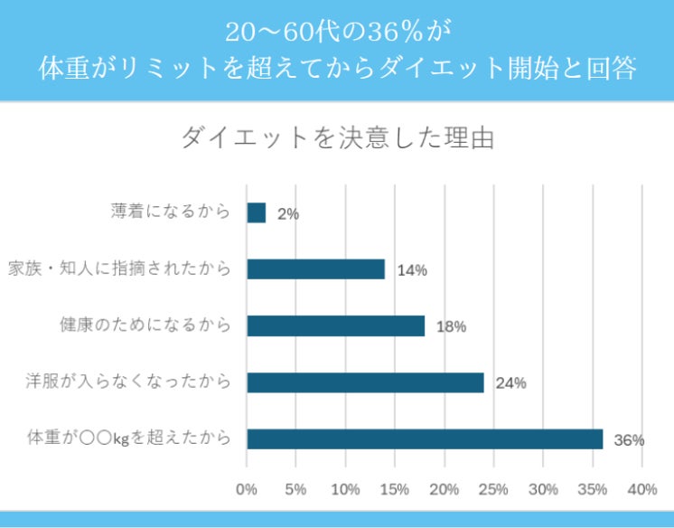 ダイエットを決意した理由で最も多かったのは「体重が〇〇kgを超えたから(以下、体重が~)」でした。