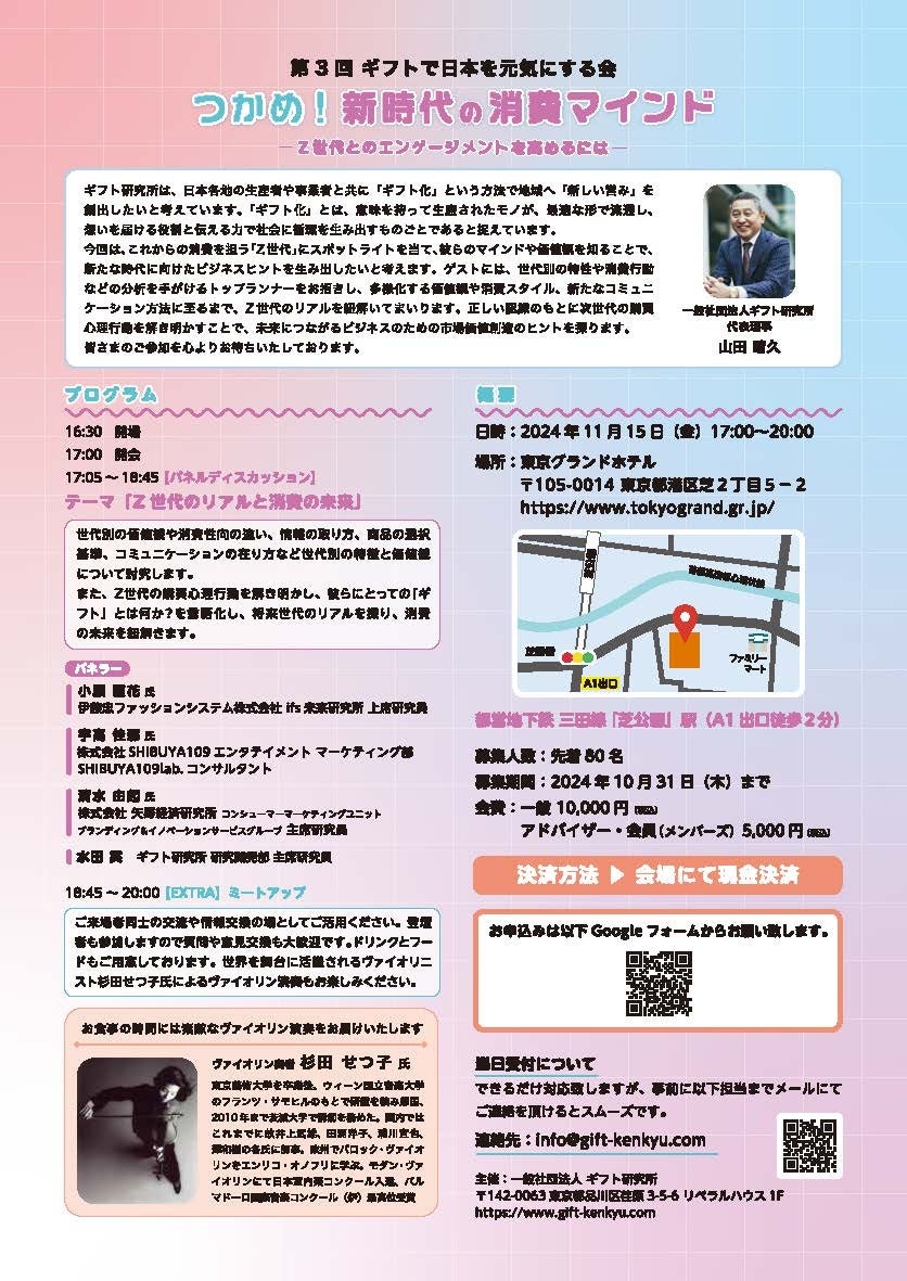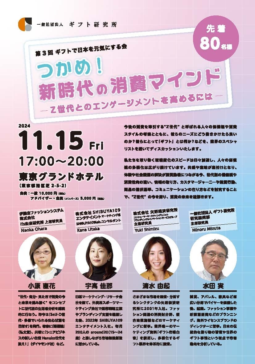 『ギフトで日本を元気にしよう』をスローガンに、ギフトマーケットの活性化と地域共創事業を柱に活動する一般社団法人ギフト研究所(東京・品川区)が、第3回「ギフトで日本を元気にする会」を開催します。今回は、世代別の特性や消費行動などの分析を手がけるトップランナーをゲストにお迎えし、「つかめ!新時代の消費マインド -Z世代とのエンゲージメントを高めるには-」をテーマに、パネルディスカッションを行ないます。
