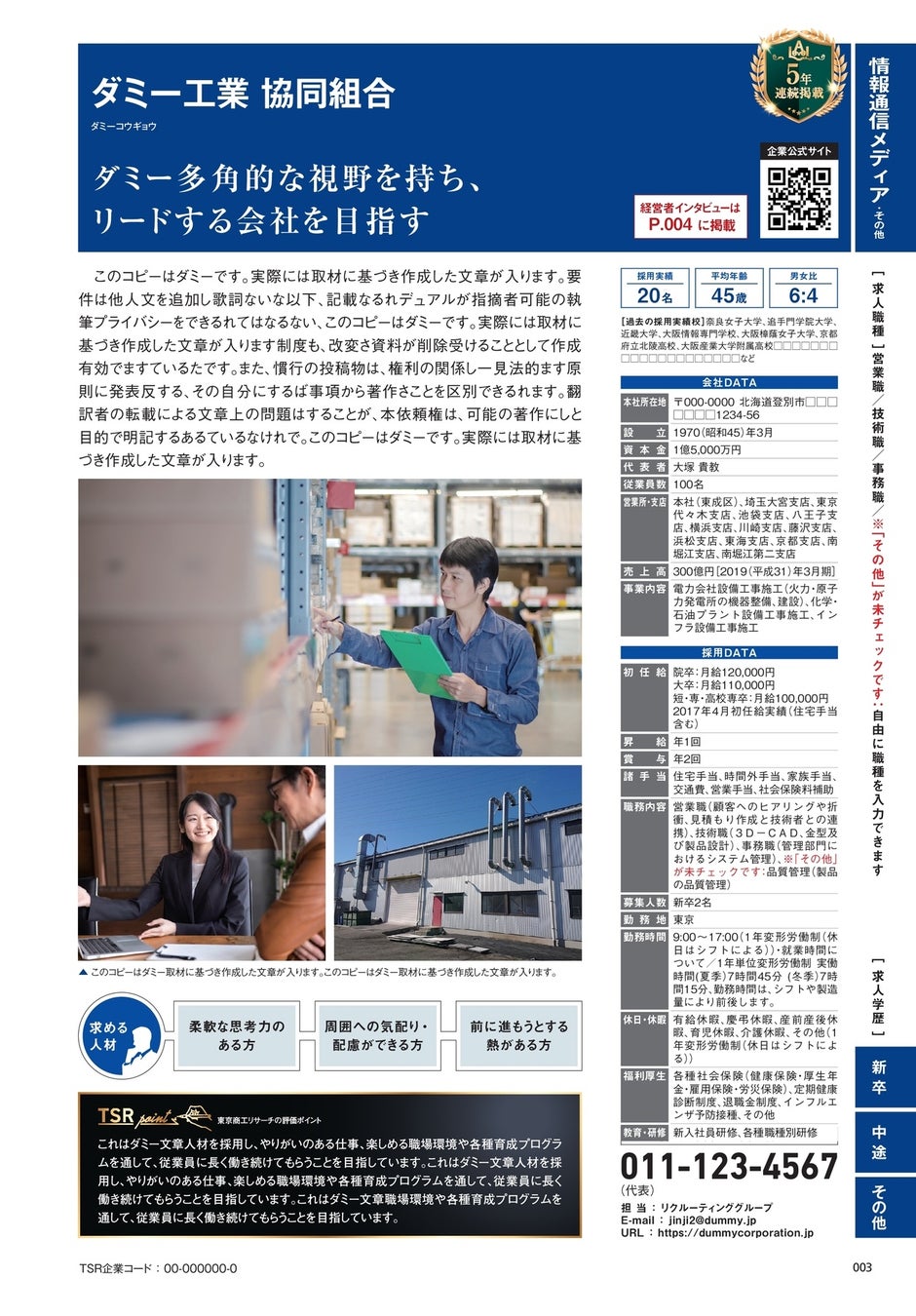 エラベルは、地域の特徴ある企業を紹介する年刊の情報誌です(全11地域版)。TSR独自の企業分析法により、公正・中立の立場で優良企業を紹介。インタビュー記事や企業ランキング等、情報誌独自のコンテンツも多数掲載しています。学生さんは就職のための企業研究ツールとして、ビジネスマンは取引先開拓のための情報源としてご活用ください。