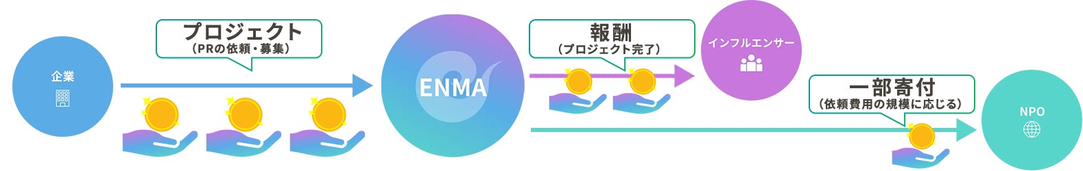 企業によるインフルエンサーへのPR依頼費用に応じた金額が、ENMAからNPO団体へ寄付される仕組みになっています。