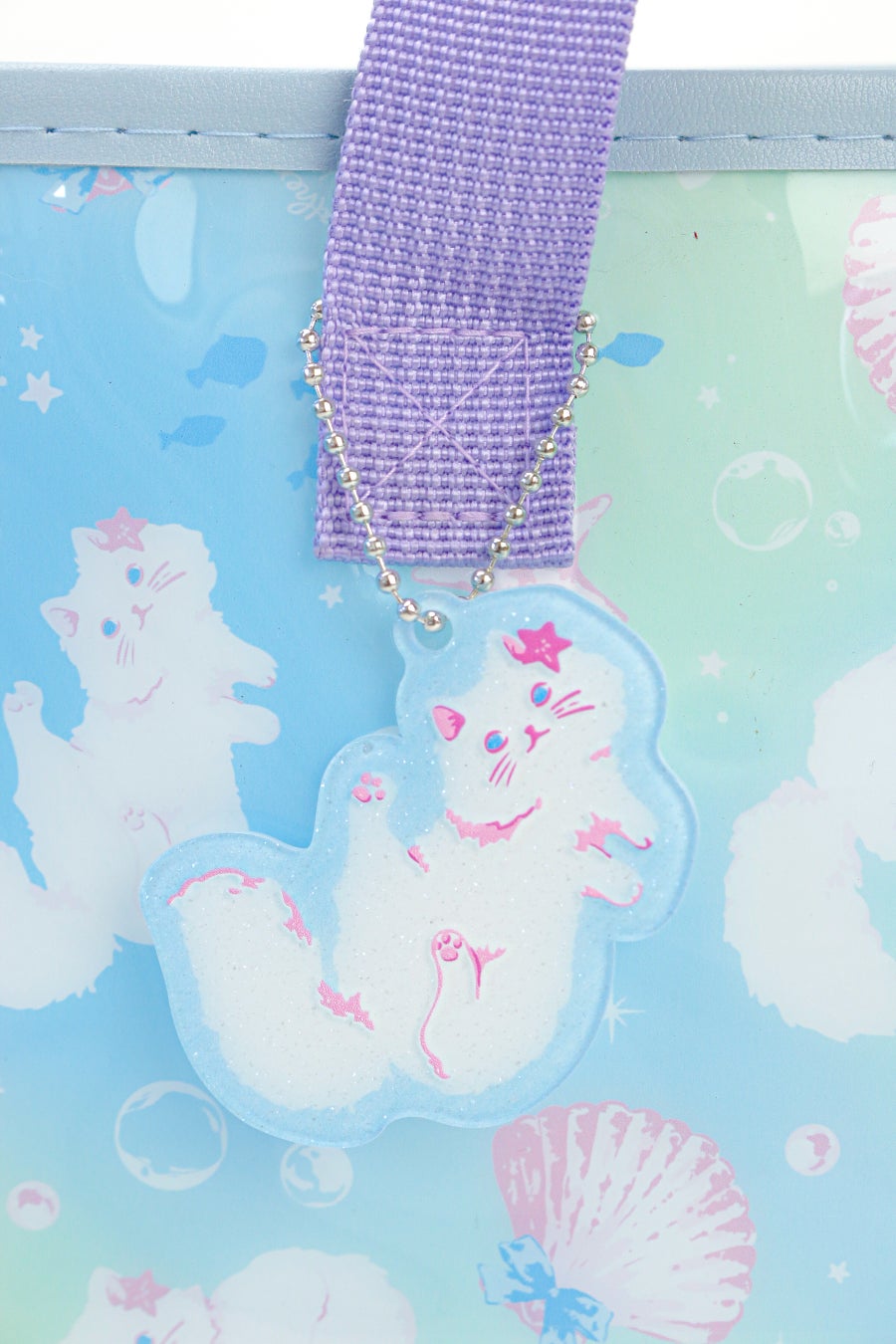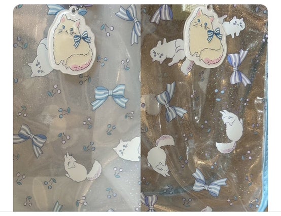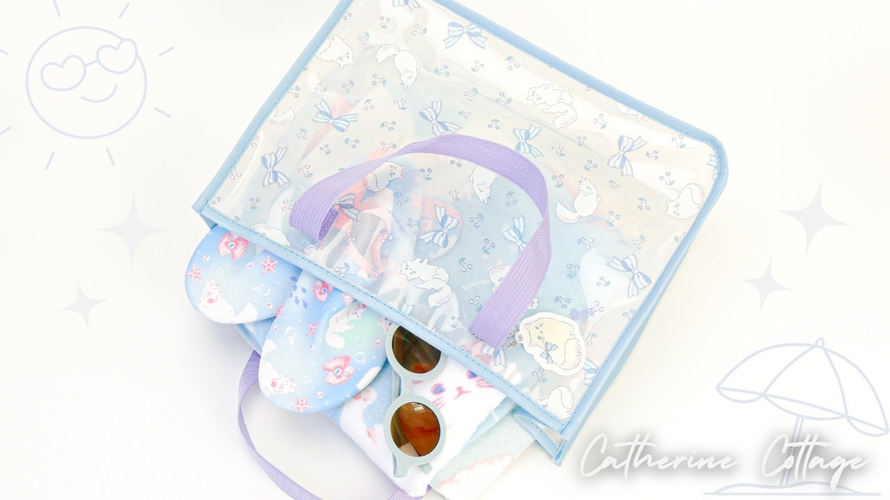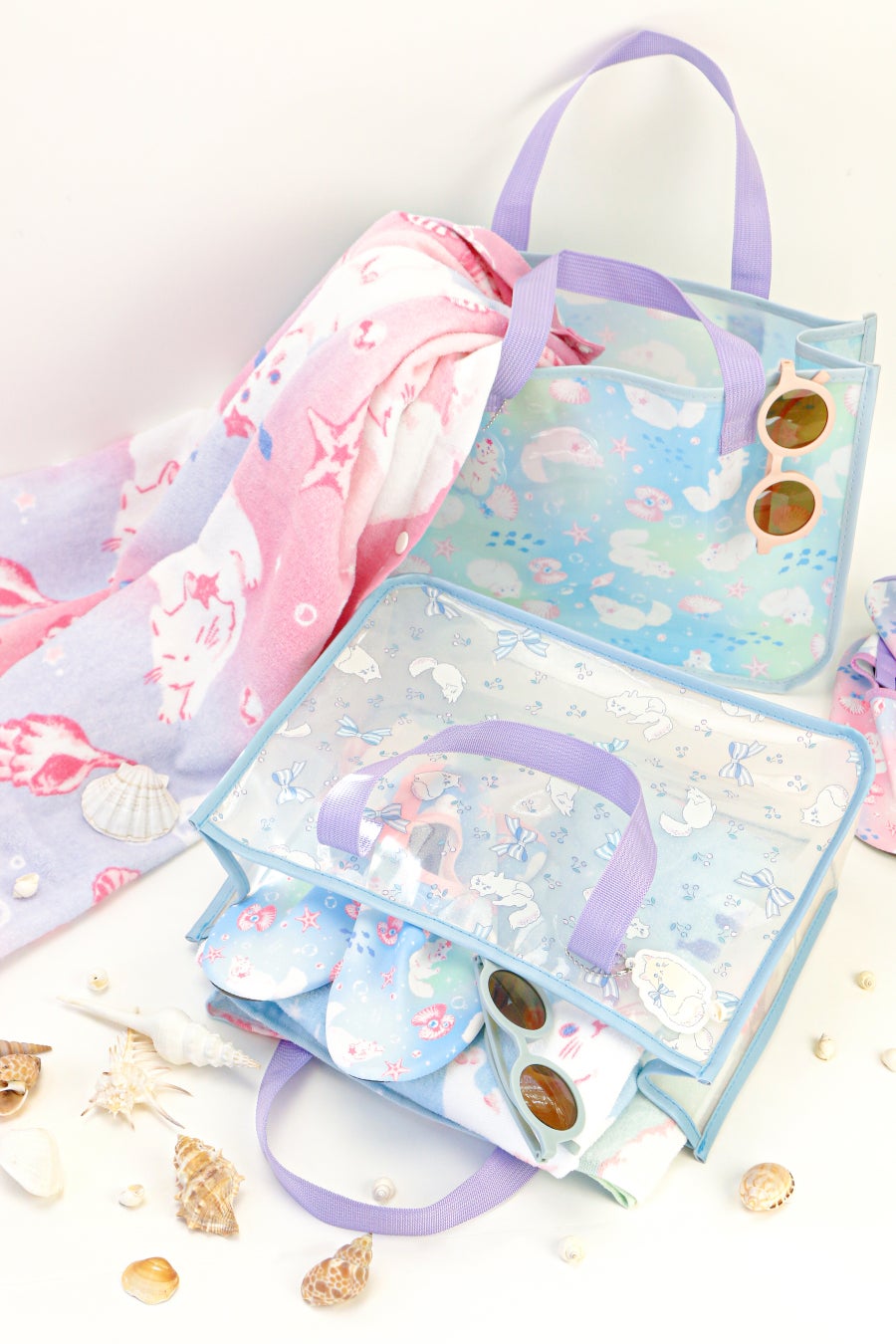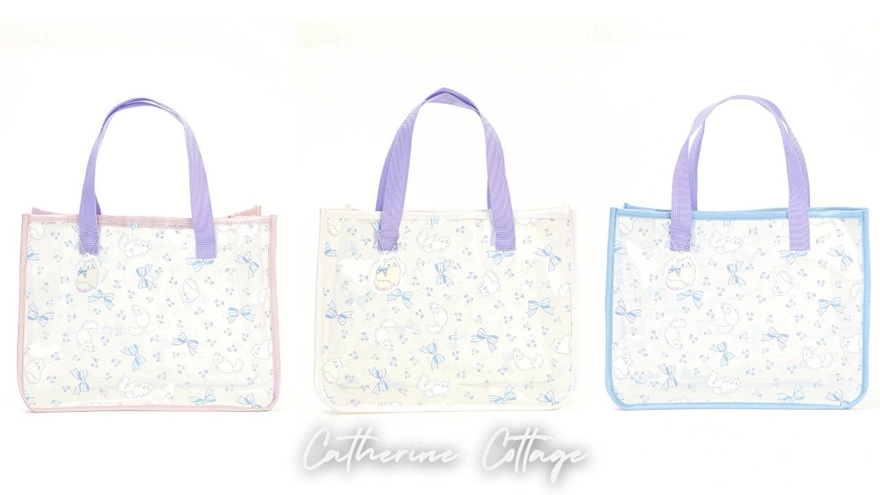 試作段階でデザイン候補が2つありましたが、キャサリンコテージオフィシャルSNSのフォロワーさんからのアンケート結果により、半透明のプールバッグが圧倒的に支持されました。プールバッグの中身が見えにくい安心感や、ファッション性にも優れたデザインとなっております。新商品「キーホルダー付きオリジナル柄プールバッグ(YJBG2)」には、キャサリン猫リボン柄とキャサリン猫マリン柄の2柄、全5色がございます。詳細な商品情報や取扱店舗については、以下のリンクをご参照ください。。