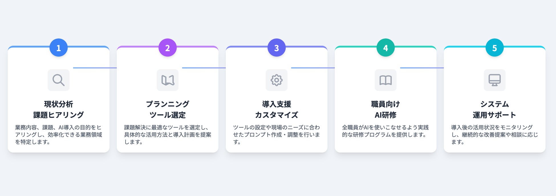 本サービスは、大規模なシステム投資が難しい小規模の事業所にも対応可能です。「AIを試してみたいが、何から手をつければ良いかわからない」「特定の業務だけを効率化したい」といったニーズに柔軟に応えます。