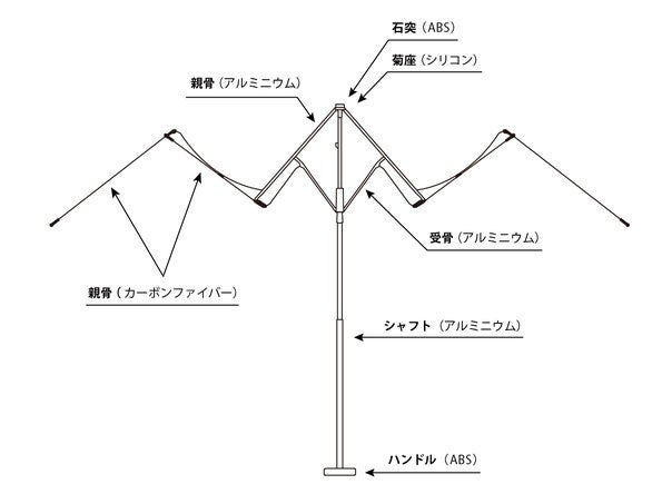 生地を支える部分の骨は3段に折れ曲がる構造。軽量で丈夫なカーボンファイバーとアルミニウム素材で構成されています。