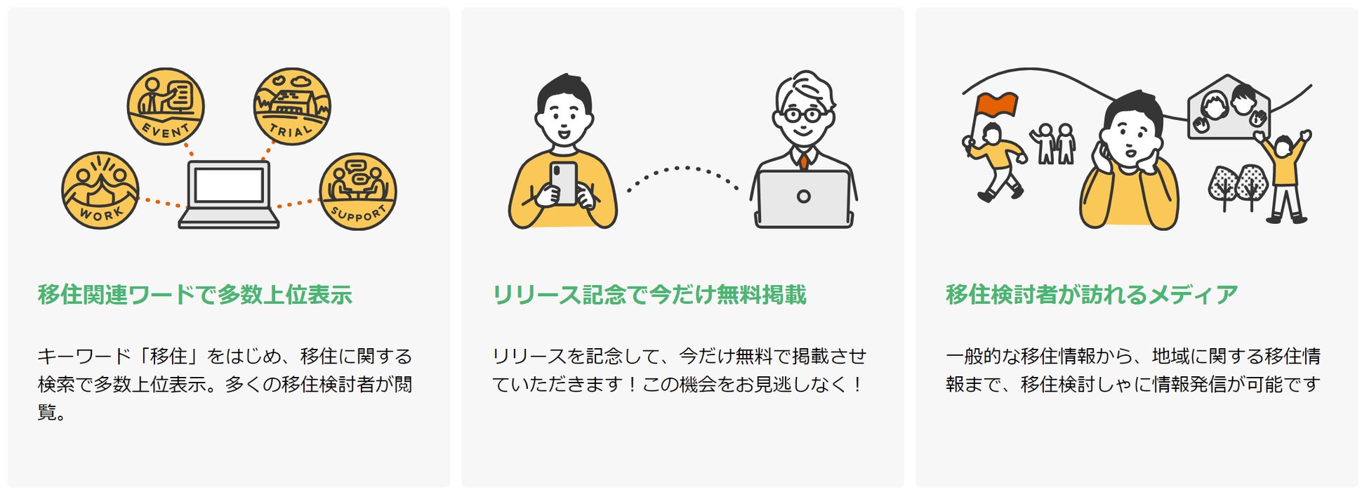 移住希望者を増やしたい各自治体様に向け、先着3名様まで、「移住したい」内でPR記事を無料で制作・不動産情報を無料で掲載いたします。