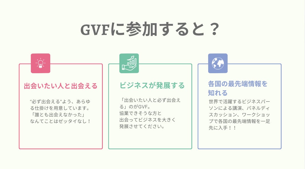 大イベントGVFは、世界で活躍するビジネスパーソンによる講演、パネルディスカッション、