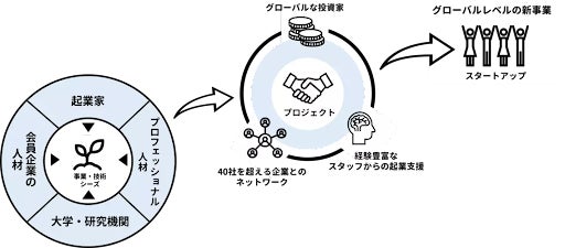 異業種/業界の専門知識や経験、異分野の技術などを有した人材がタッグを組み、大学や研究機関、企業発の特許技術や事業化前のタネを元にプロジェクトを組成し、プロトタイピングを行いながら事業化を目指しています。