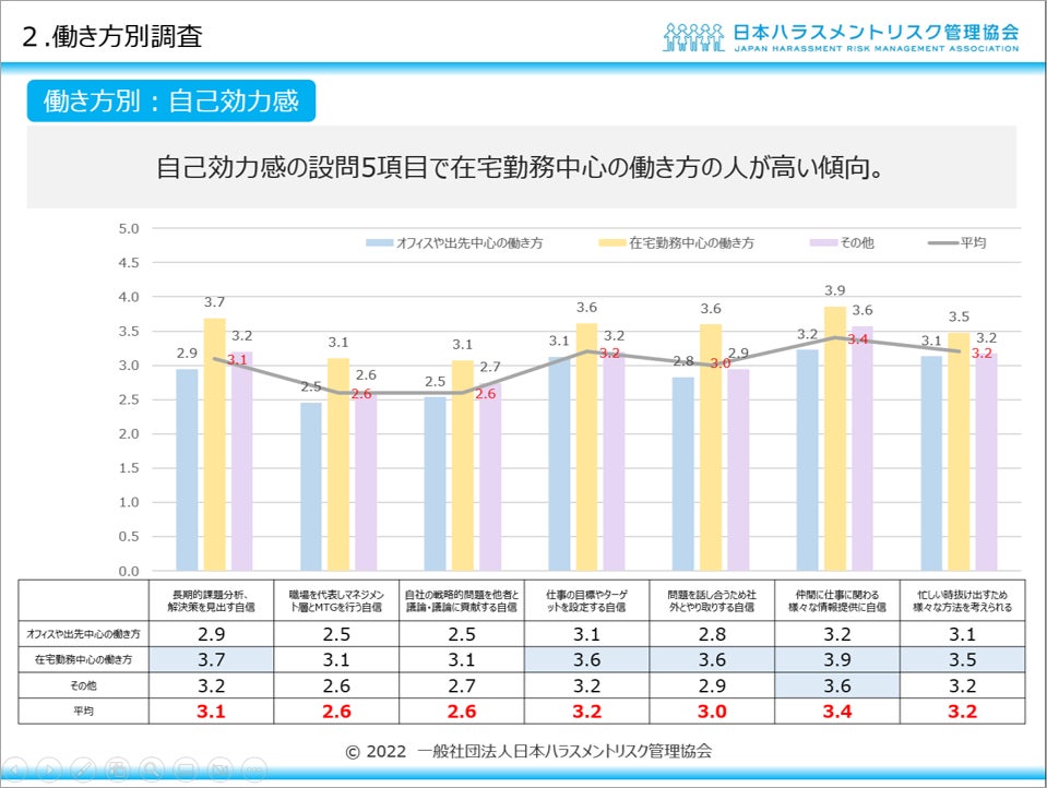 在宅勤務の懸念点としてコミュニケーションが薄くなり、若手が成長しないのではないかと言われることがありますが、「長期的課題分析、解決策を見出す自信」「問題を話し合うために社外とやり取りする自信」のような思考が重要な業務において在宅勤務者の結果が高く出ています。コロナが明けてオフィス勤務に戻す流れもありますが、従業員のストレス状態も鑑みて働き方を検討するのはいかがでしょうか。