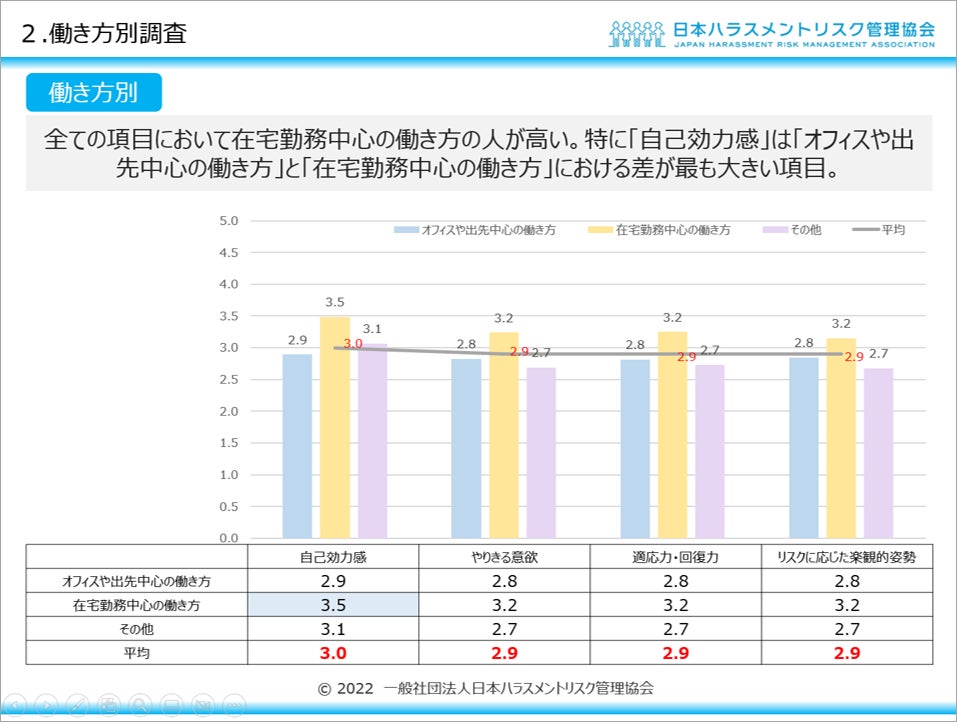 「自己効力感」「やりきる意欲」「適応力・回復力」「リスクに応じた楽観的姿勢」の4項目、計24問の設問で分析した結果、年代別においては大きな差が見られませんでしたが、働き方別においては大きな差があり、在宅勤務中心の働き方をしている人は各項目で高い(ポジティブな)傾向がみられました。