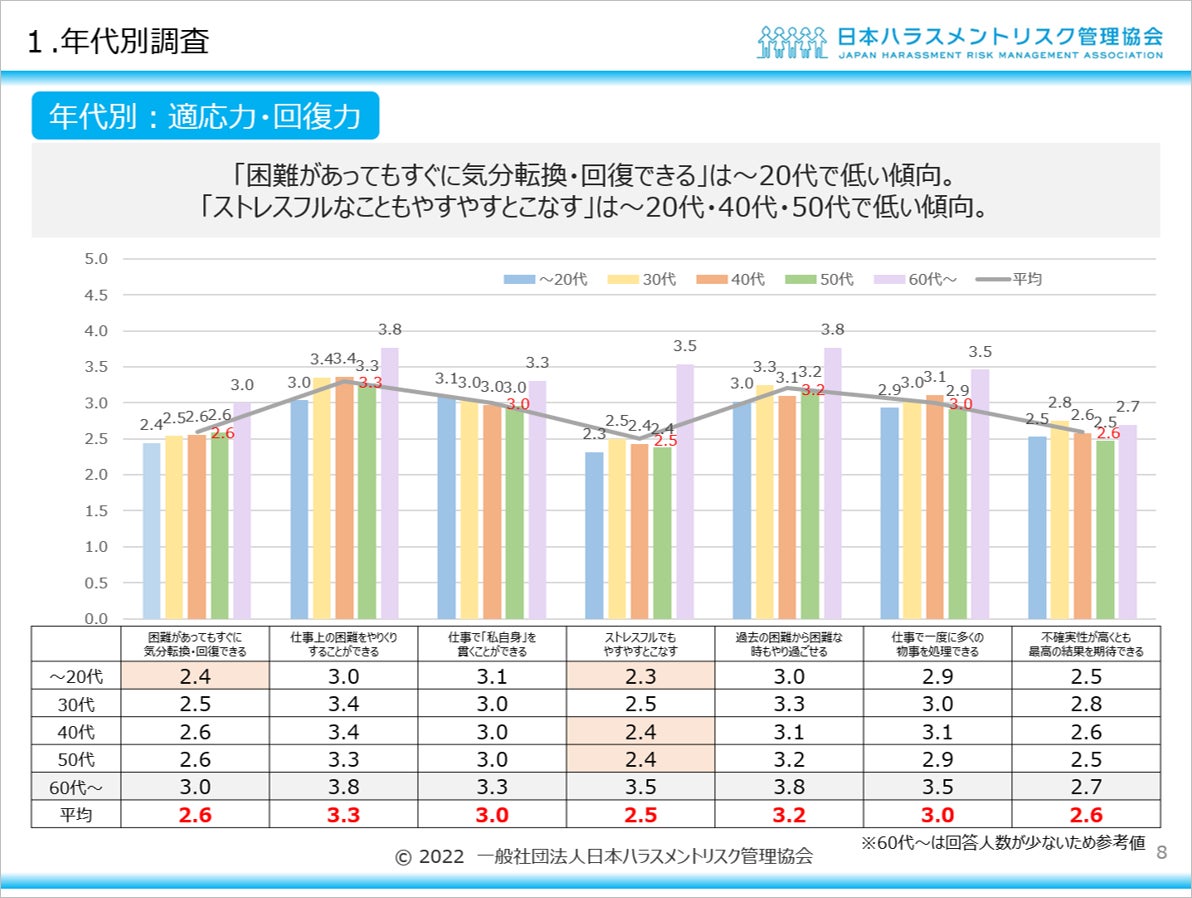 ・適応力・回復力では~20代で「困難があってもすぐに気分転換・回復できる」、~20代・40代・50代で「ストレスフルなこともやすやすとこなす」が低い傾向であった。
