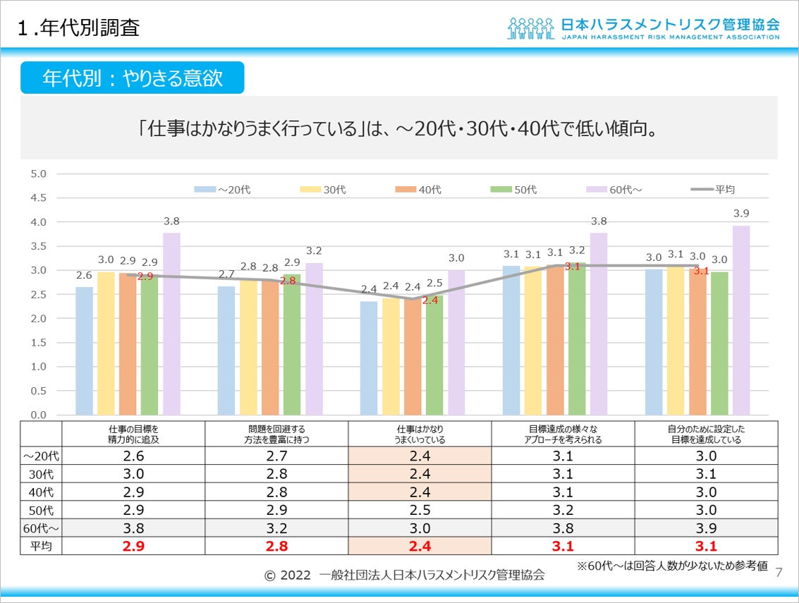 年代別の各設問単位においては、比較的若い世代で低い(ネガティブな)回答が目立った。設問内容は、具体的な業務に関するものよりも、「仕事がうまく行っている」など漠然とした項目で低さが目立つ。