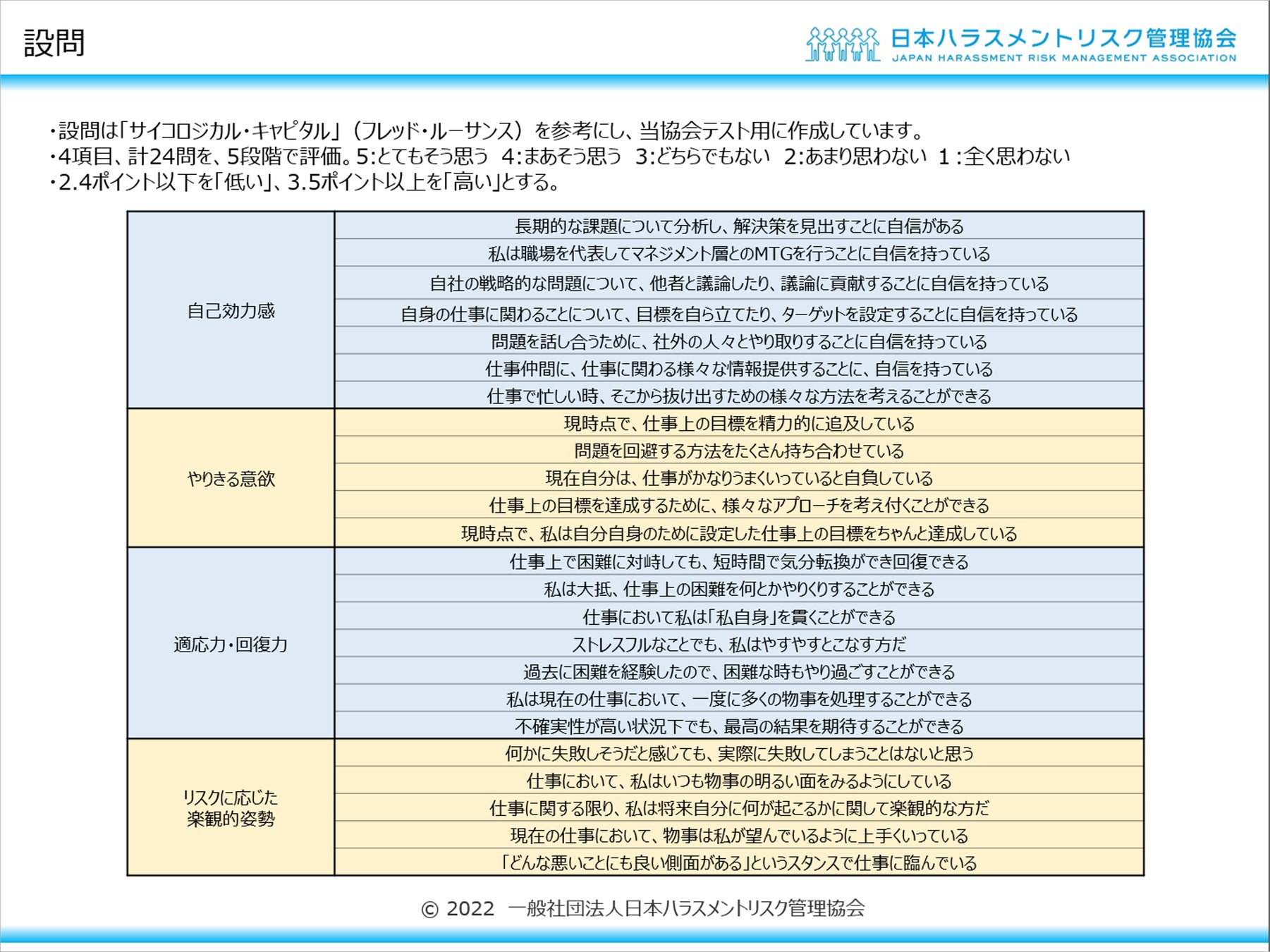 当テストは、米経営学者のフレッド・ルーサンス提唱「サイコロジカル・キャピタル」の4項目(Hope(希望)、Efficacy(自己効力感)、Resilience(レジリエンス)、Optimism(楽観性))を参考とし、WEBテスト用に設問を作成しています。