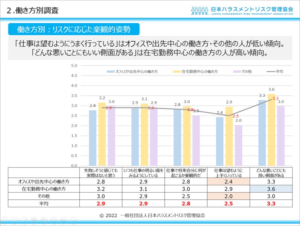・リスクに応じた楽観的姿勢では「仕事は望むようにうまく行っている」がオフィスや出先中心の働き方・その他の人が低い傾向。「どんな悪いことにもいい側面がある」が在宅勤務中心の働き方の人が高い傾向であった。